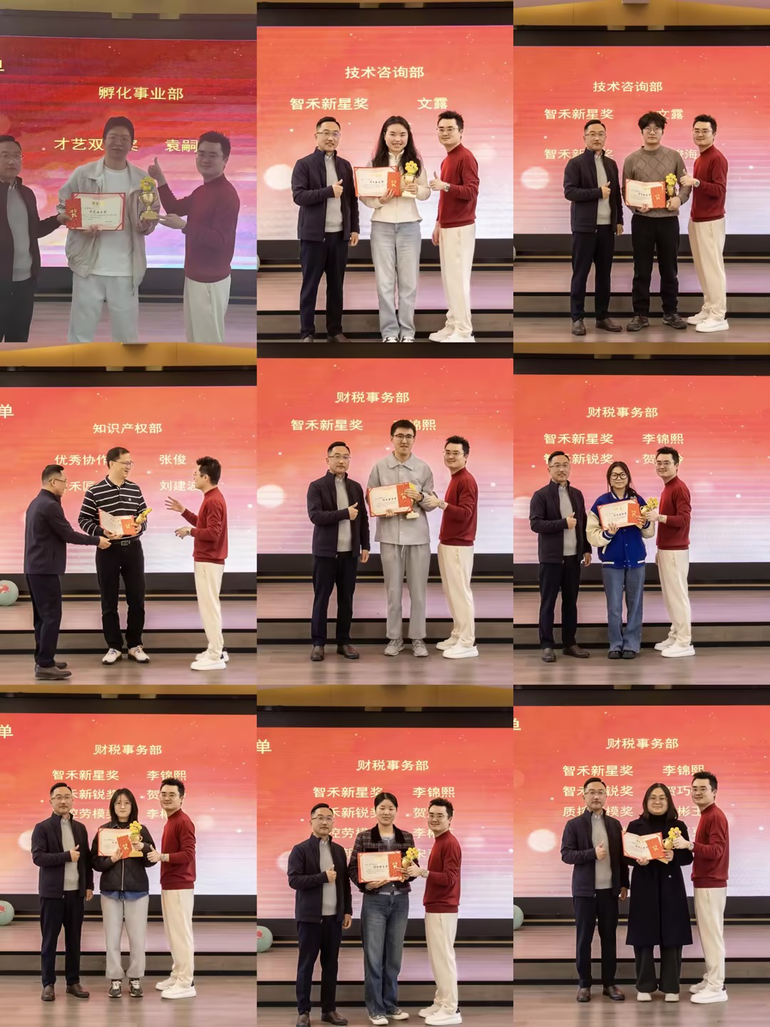 致辞环节结束后,2025年优秀员工表彰仪式如期而至。随着光荣榜单揭晓,现场掌声雷动、欢呼声不断,孵化事业部、技术咨询部、知识产权部、财税事务部等部门的优秀员工依次亮相,他们以专业与担当诠释智禾专业与匠人精神,成为全体同事学习的榜样,也为现场增添了欢愉与暖意。